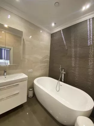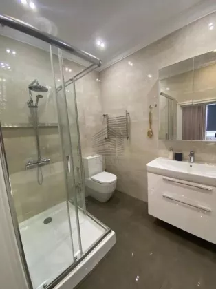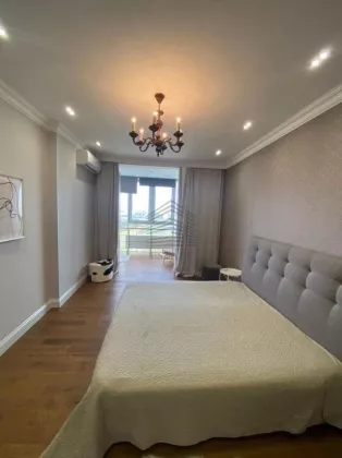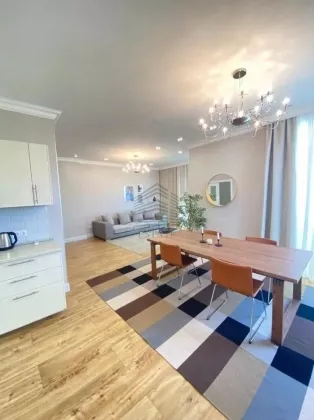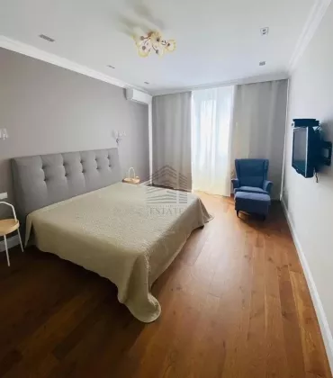 Площадь — 130 м², 16 этаж из 22, планировка: кухня-гостиная 50 м², две спальни (в том числе хозяйская с собственным санузлом и гардеробной), два санузла, ванная и две душевые кабины. Квартира полностью меблирована и оснащена техникой: духовой шкаф, варочная панель, посудомоечная машина, стиральная машина, сушильная, холодильник, кондиционеры во всех комнатах, бойлер на 150 л, тёплые полы. Ремонт европейского уровня, материалы — Испания и Италия. Дом кирпично-монолитный с вентфасадом из керамогранита, закрытая территория, охрана, видеонаблюдение, консьерж, подземный и наземный паркинг.