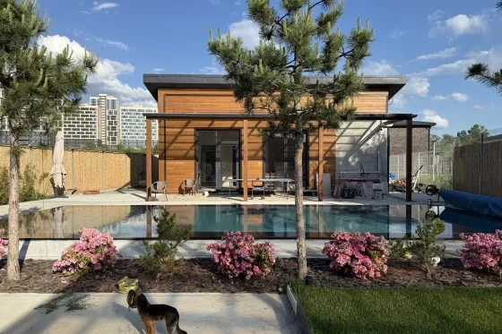 Новый дизайнерский дом 381 м² в элитном коттеджном поселке «Зелёный Остров» на берегу реки Кубань — с открытым круглогодичным бассейном, баней и хаммамом