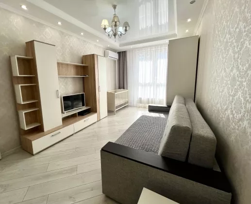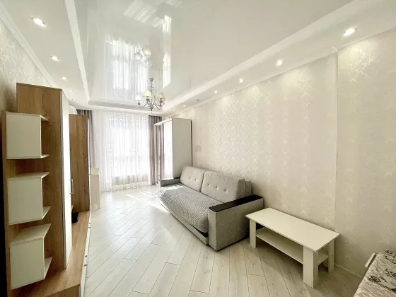 Квартира находится на 13 этаже . Из окон открываются потрясающие виды на историческую часть города. Планировка: общ. S=40 м, спальня и кухня-гостиная, с/у, просторная витражная лоджия .