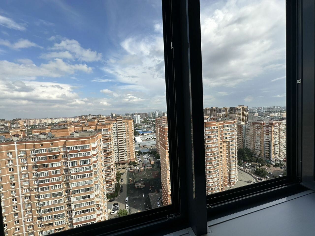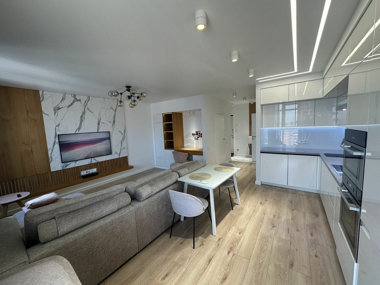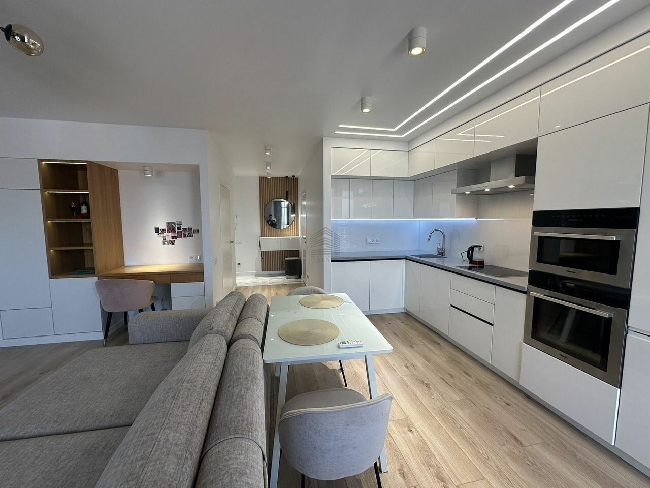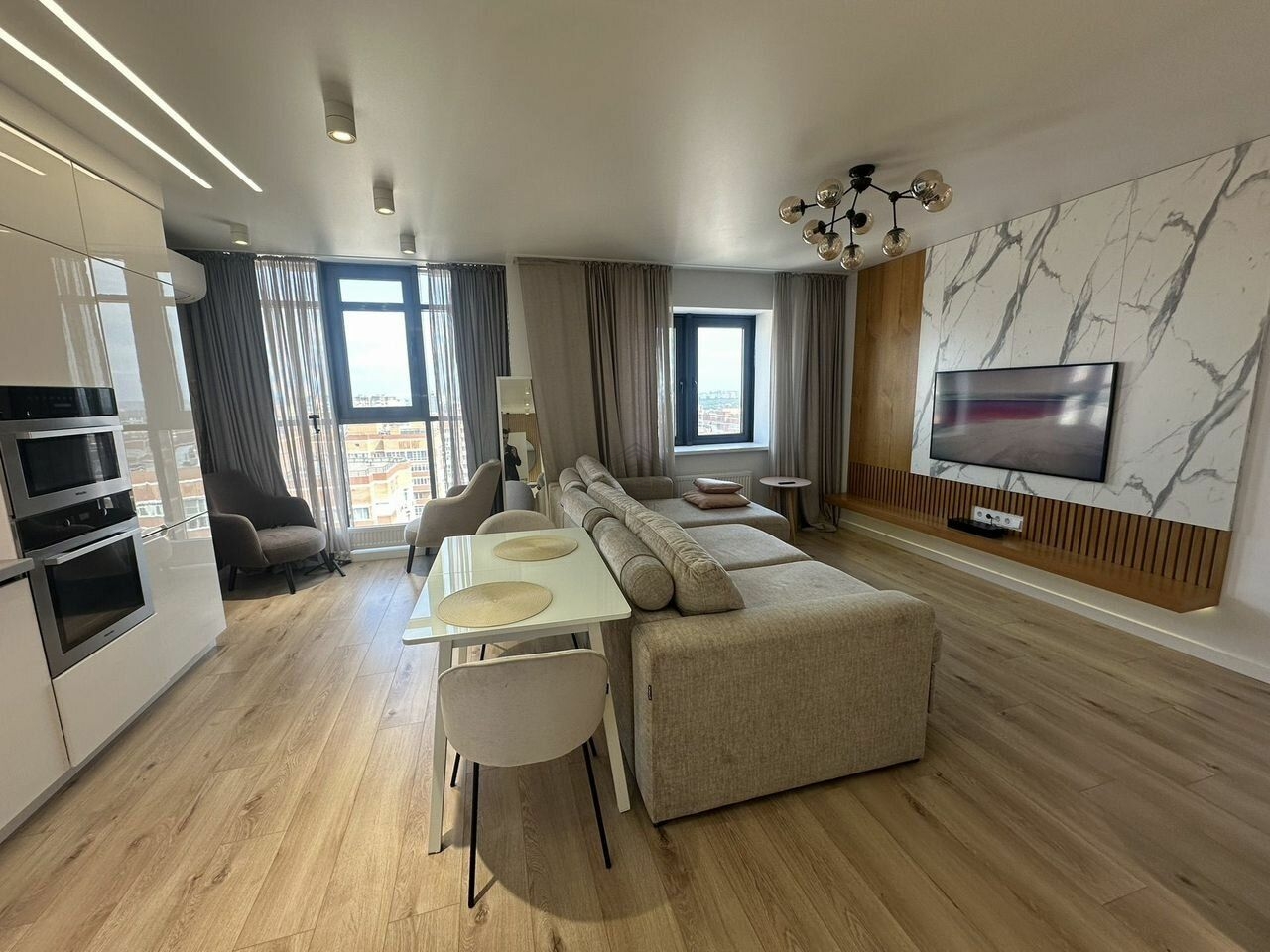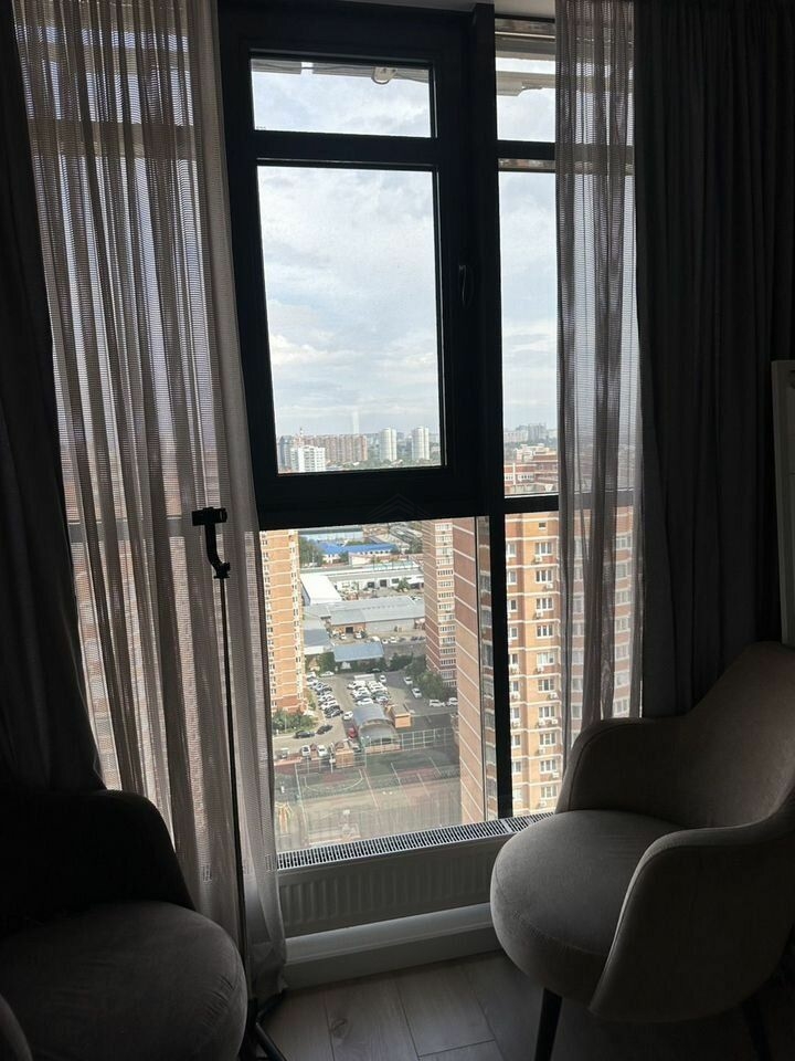 Квартира находится на 24 этаже . Из окон открываются потрясающие виды.Планировка: общ. S=41 м, спальня и кухня-гостиная, с/у, просторная витражная лоджия . Квартира с дизайнерским ремонтом. Вся мебель и техника остаются.
