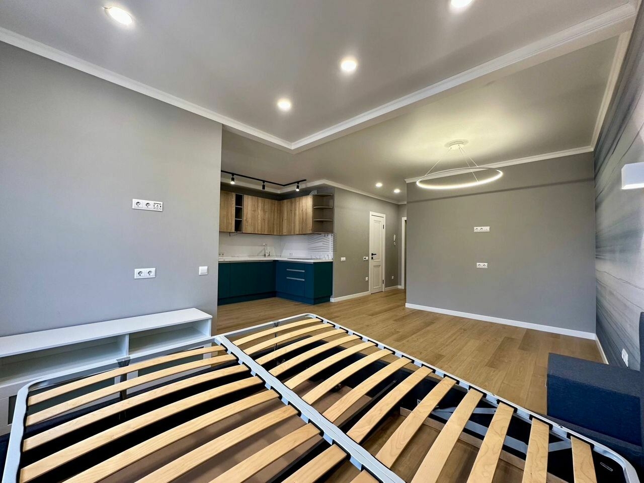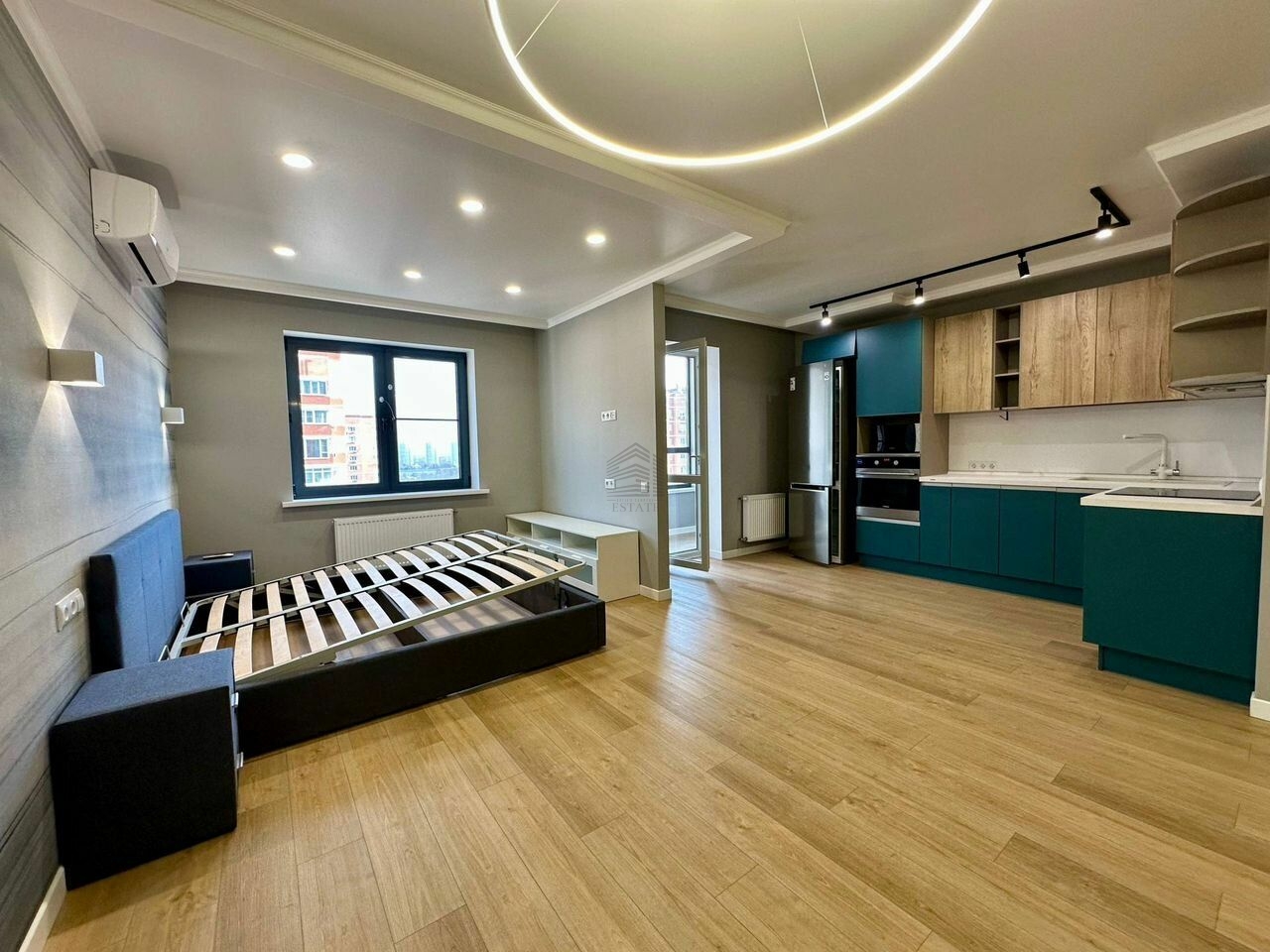 Квартира находится на 17 этаже . Из окон открываются потрясающие виды.Планировка: общ. S=44 м, спальня и кухня-гостиная, с/у, просторная витражная лоджия .