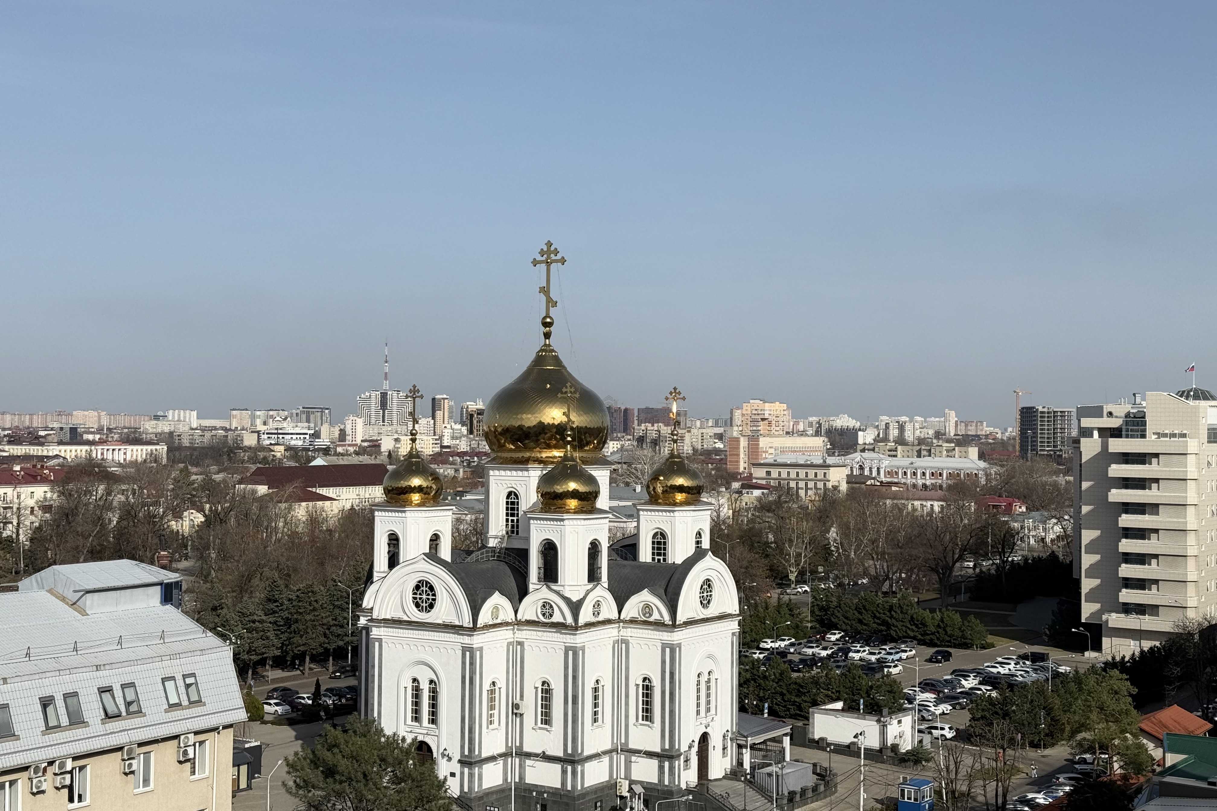 Панорамные виды на зелёные скверы, фонтаны и Войсковой собор святого Александра Невского.