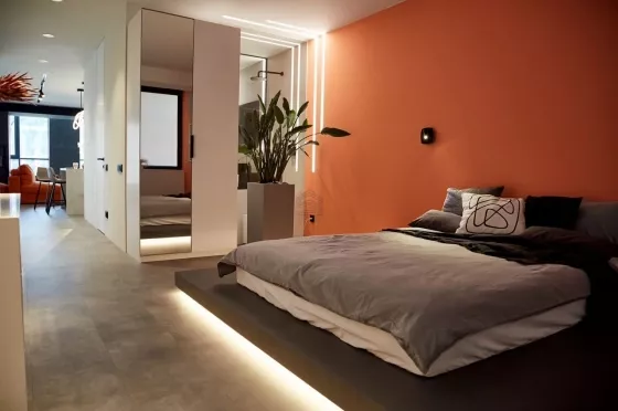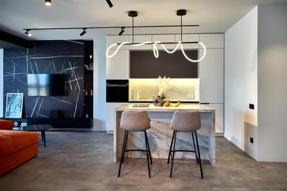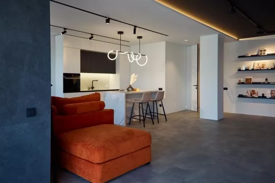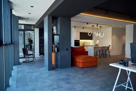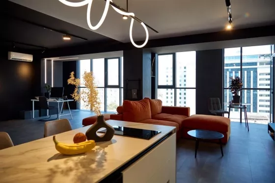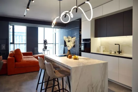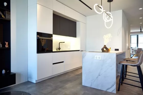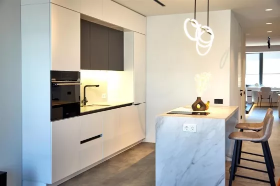 Квартира находится на 9 этаже . Из окон открываются потрясающие виды на историческую часть города. Планировка: общ. S=107 м, 2 спальни и кухня-гостиная, 2 с/у, просторная витражная лоджия .