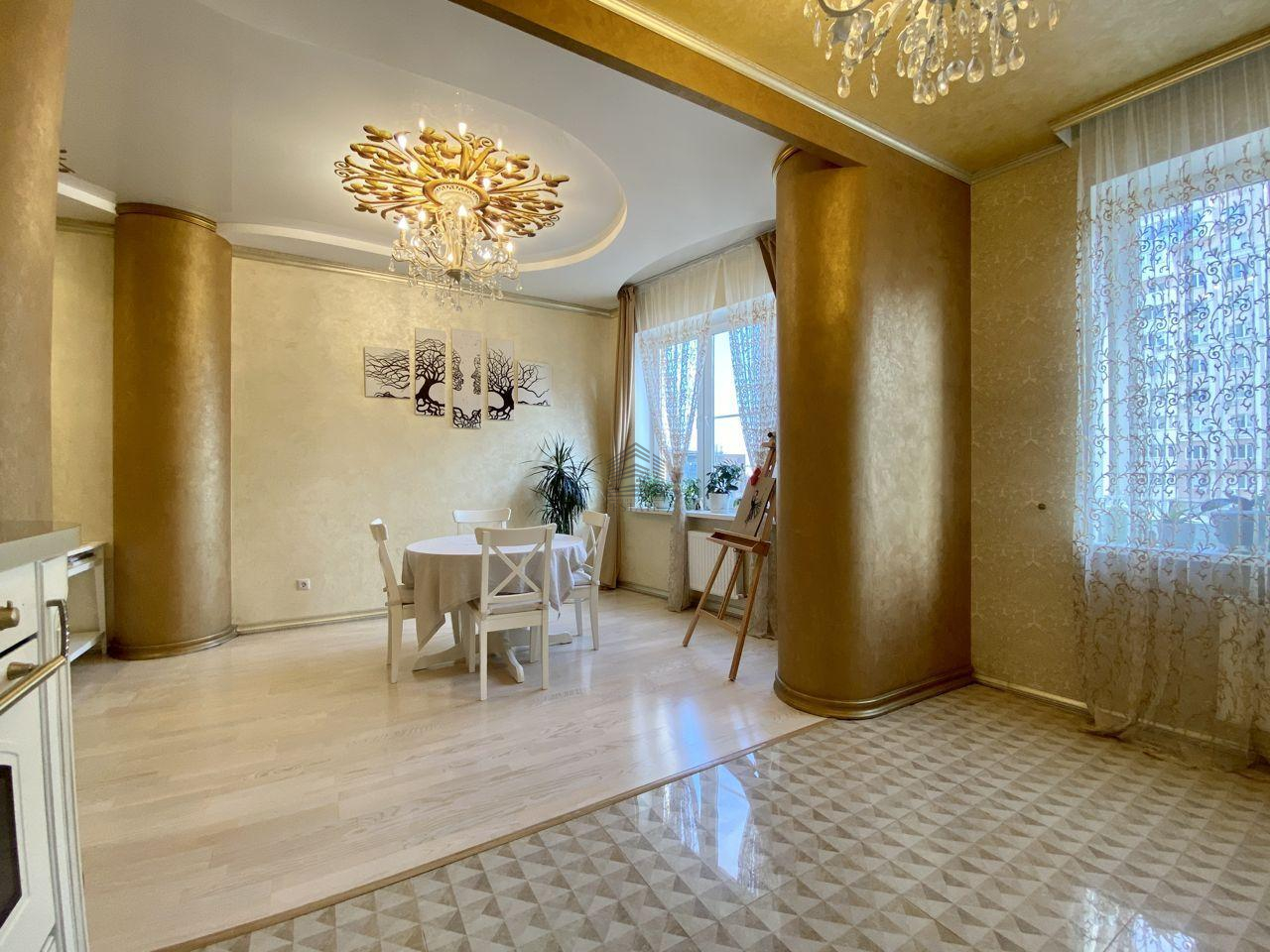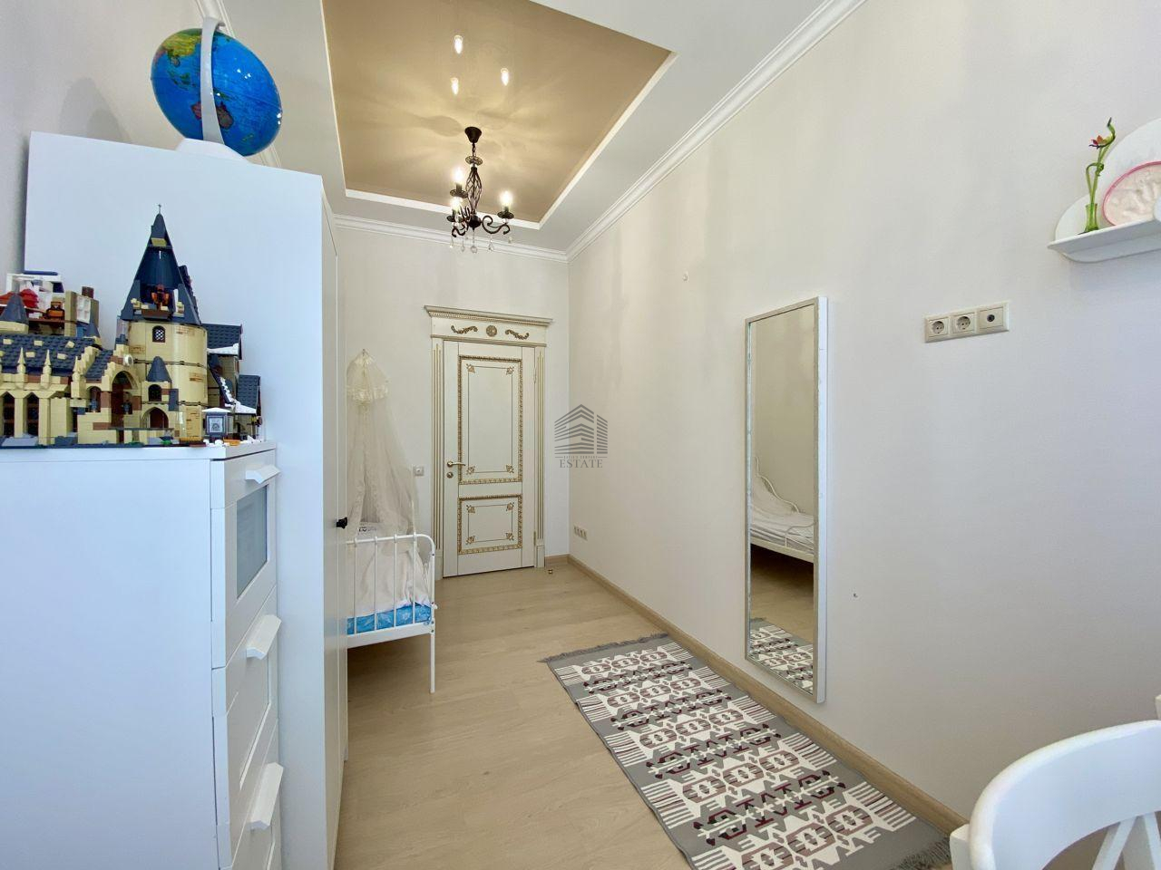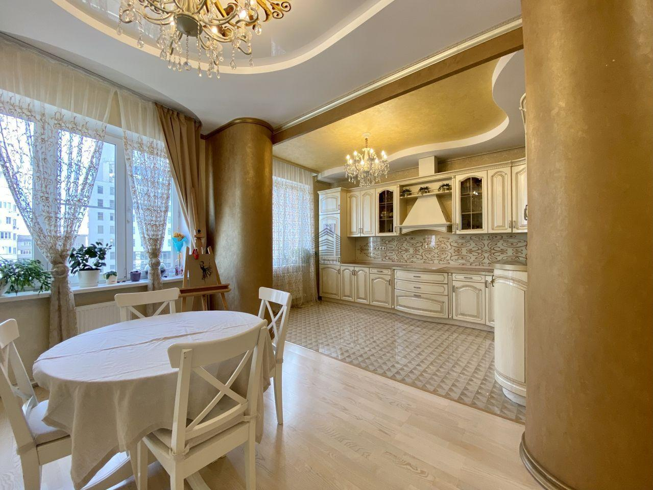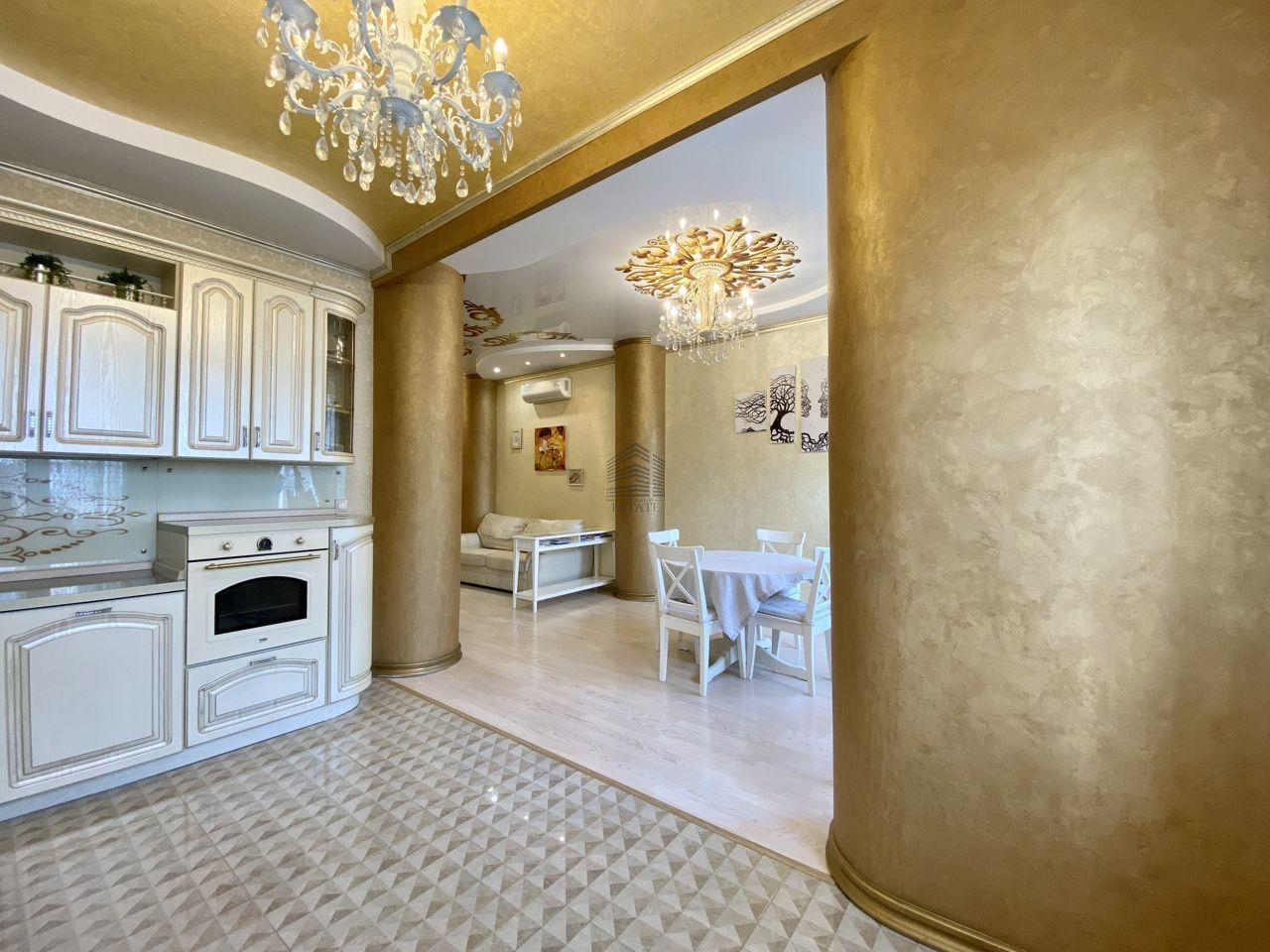 Квартира находится на 8 этаже . Планировка: общ. S=122 м, кухня- гостиная и 3 изолированных комнаты, гардеробная, 2 с/у, просторная лоджия . Ремонт в классическом стиле (светлые тона).