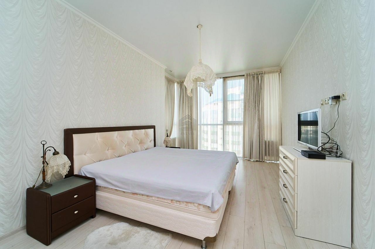 Площадь квартиры — 89,2 м², расположена на 20 этаже из 22. В квартире выполнен дизайнерский ремонт, всё продумано для комфортного проживания. Квартира светлая, просторная, с витражным остеклением и хорошей шумоизоляцией. Установлены видеодомофон, сплит-системы, встроенная кухня, посудомоечная машина, холодильник, есть большая гардеробная. Квартира полностью укомплектована мебелью и техникой — можно заехать сразу после покупки без дополнительных вложений.
