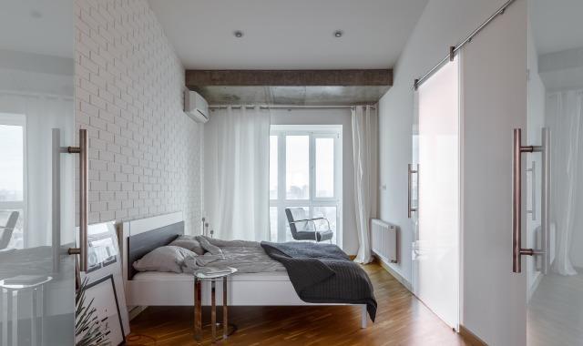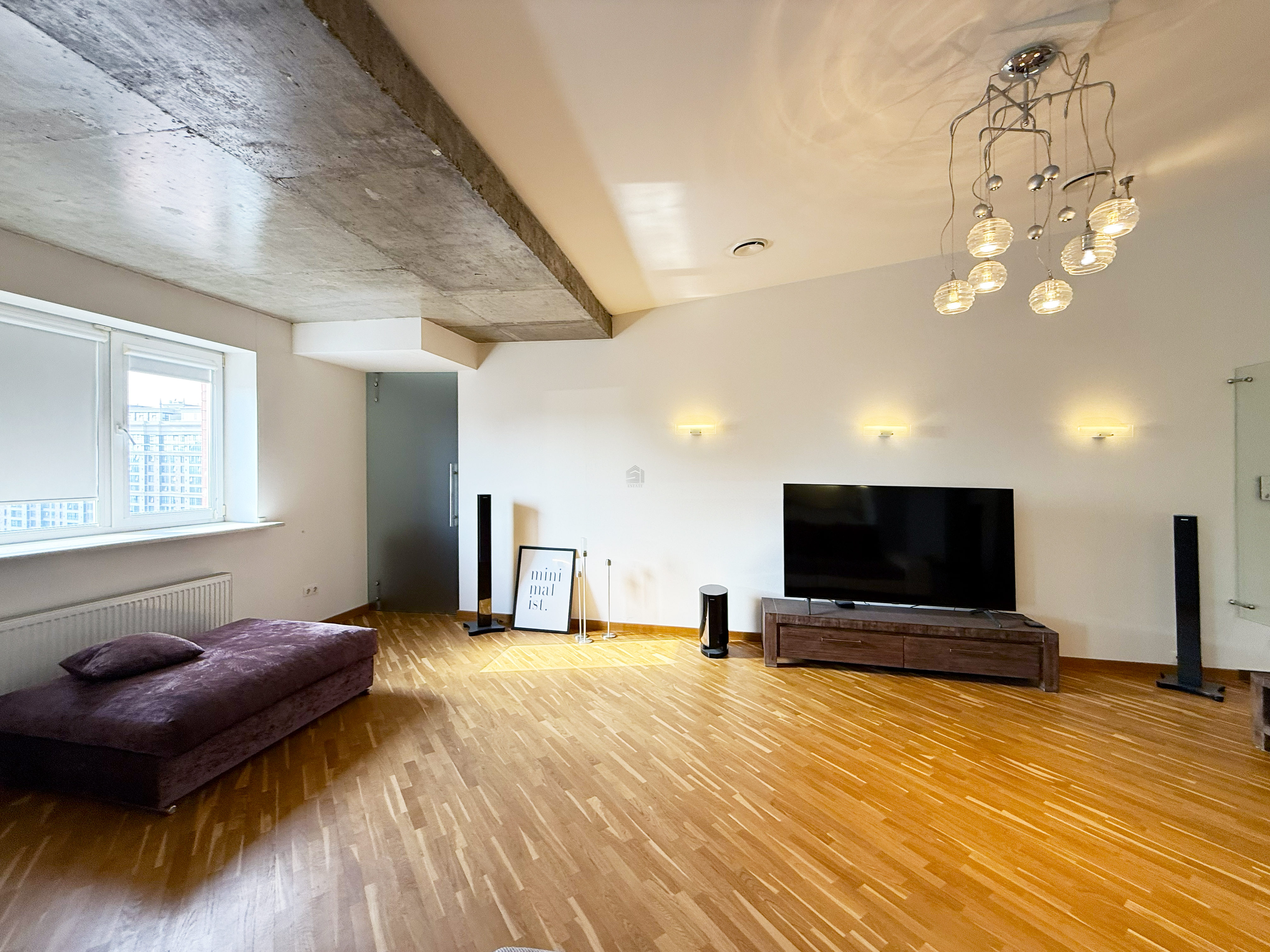 В квартире выполнен современный интерьер с элементами лофт. Использованы качественные материалы и инженерные решения: дубовый штучный паркет, тёплый пол, канальное кондиционирование, мебель из массива и кожи, немецкая кухня со встроенной техникой Siemens, система фильтрации воды, датчики протечки, видеонаблюдение, сигнализация и система “умный дом”.