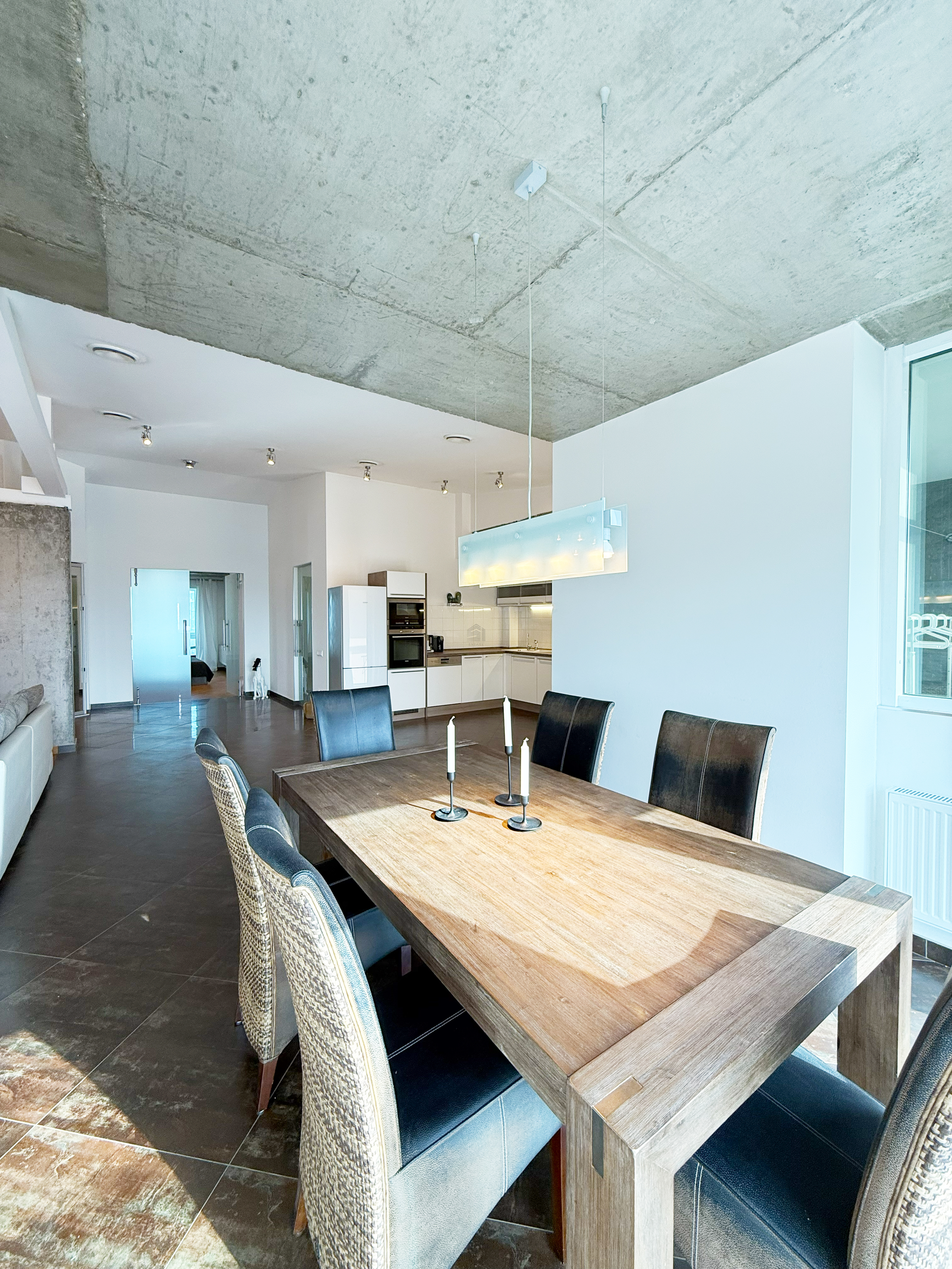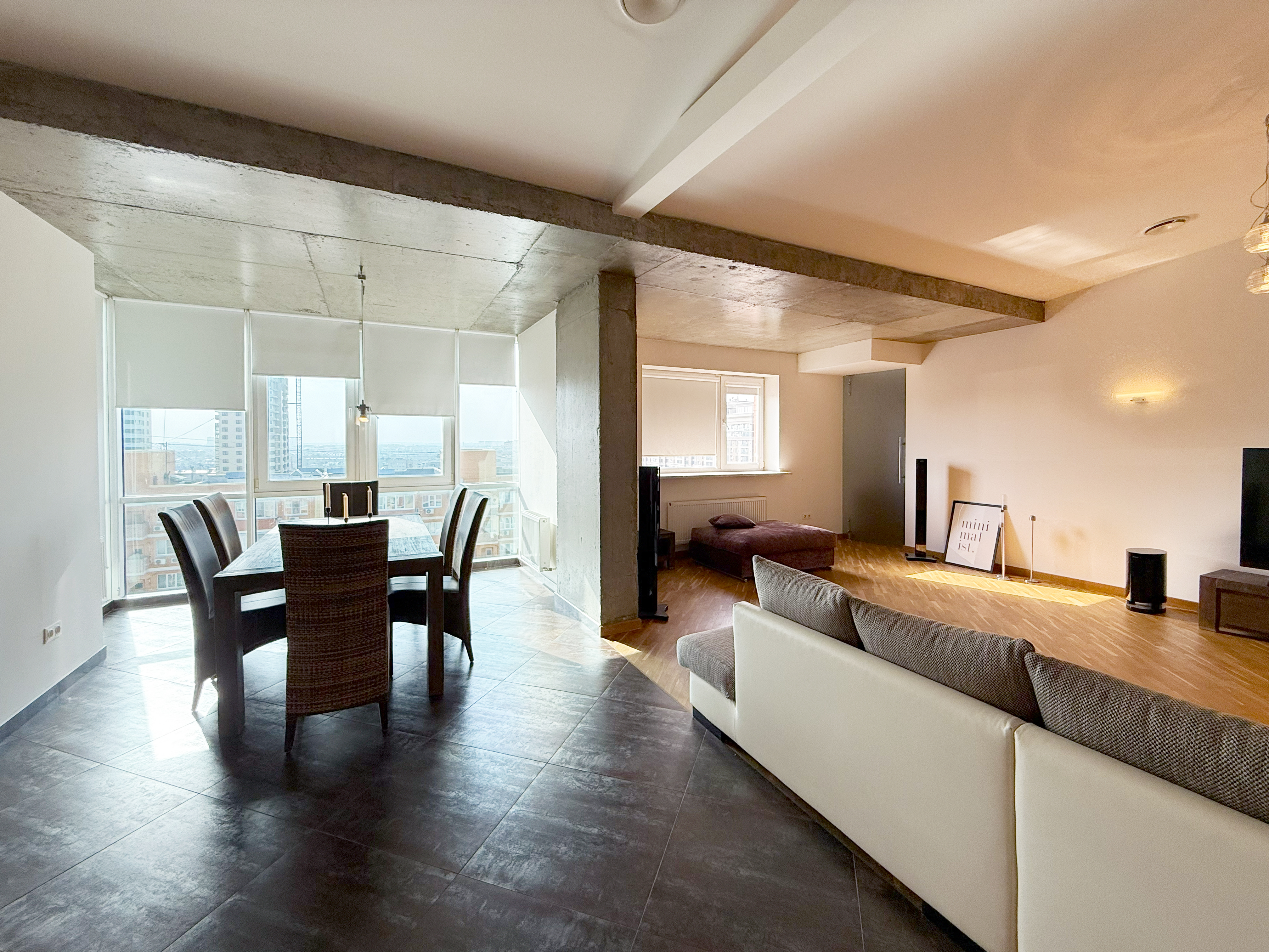 Высота потолков — до 4,5 м, панорамное остекление даёт много света и подчёркивает объём пространства.