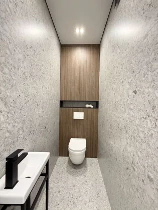 – Натуральный камень, широкоформатная плитка, качественная электрика