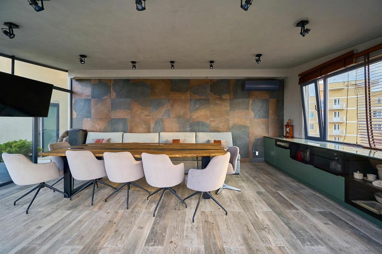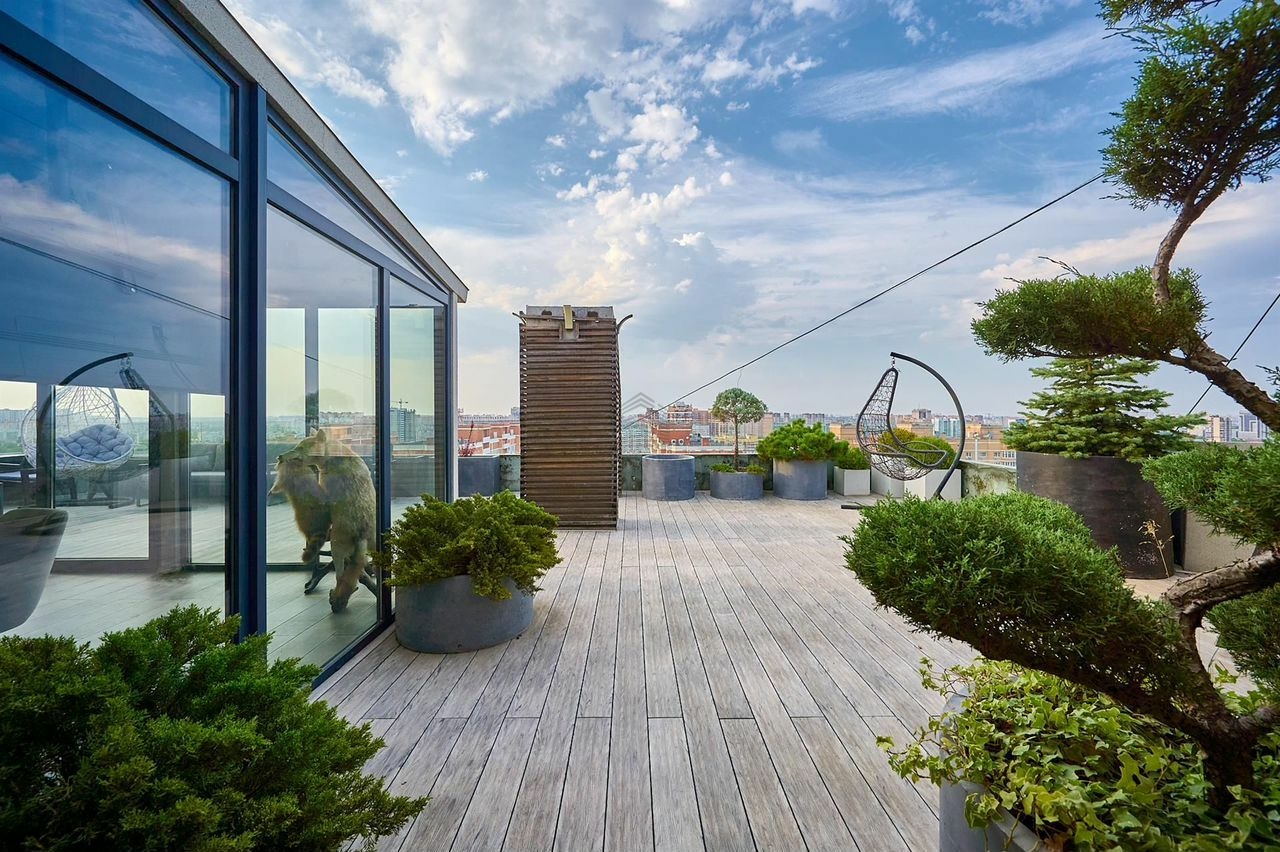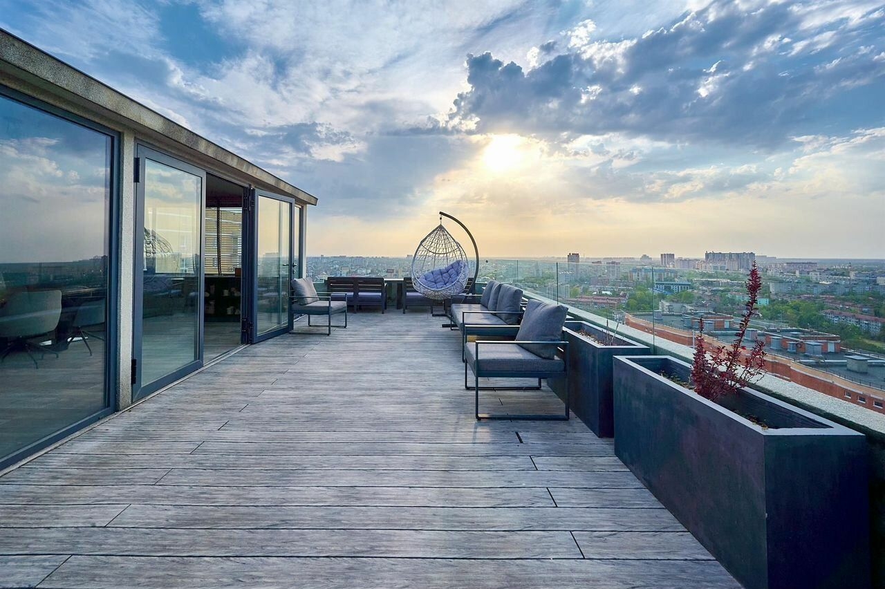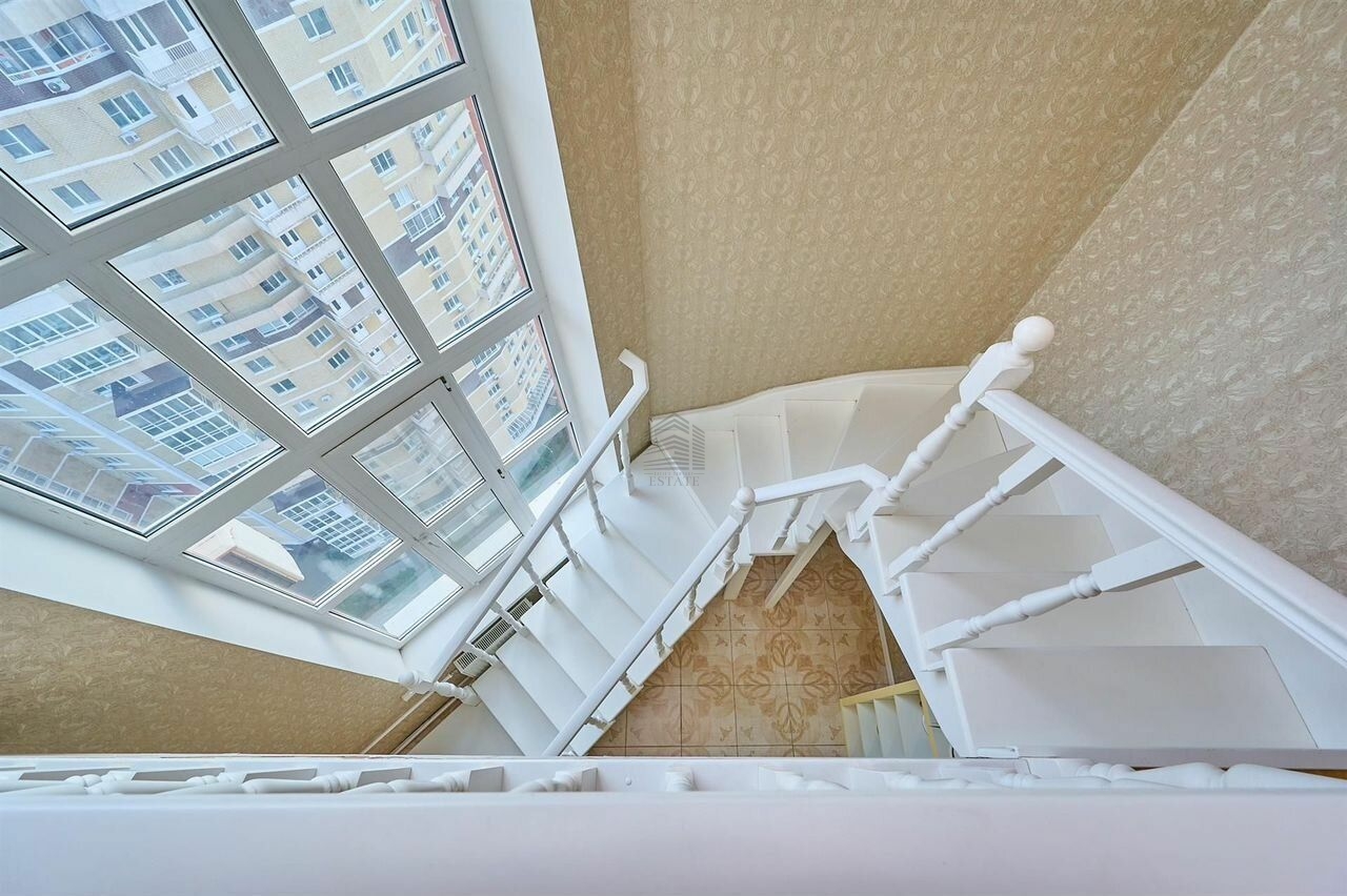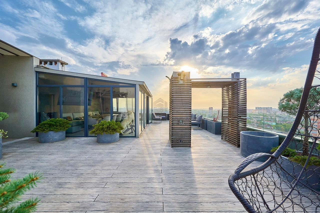 Пентхаус общей площадью 296,7 м² (жилой 165,9 м² + терраса 122 м²) расположен на 23–24 этажах 24-этажного кирпичного дома. В квартире 4 изолированные комнаты, кухня-гостиная, гардеробная с прачечной, 3 санузла, 2 застеклённых балкона и просторная терраса. Мебель на заказ из Германии, кухня с техникой Bosch, изысканные кожаные элементы в спальне и гостиной. Высокие потолки и панорамные окна создают ощущение света и простора.