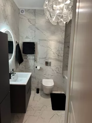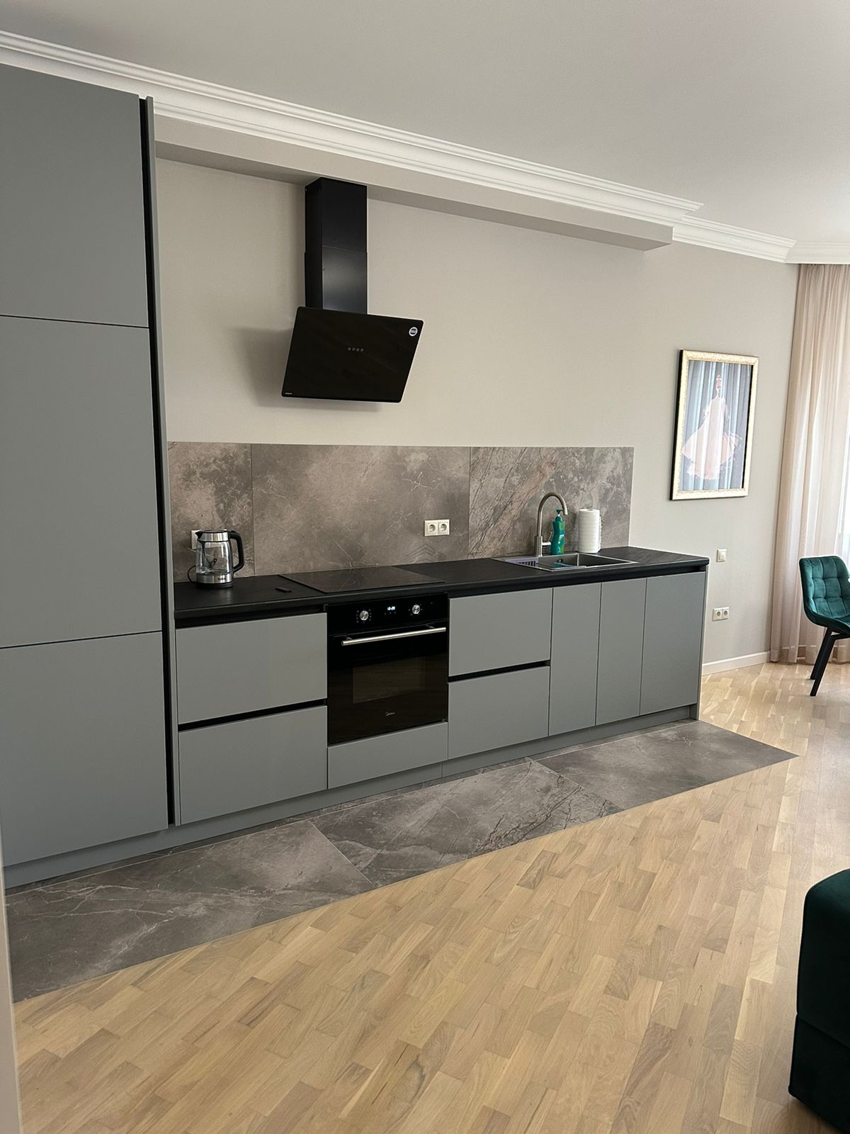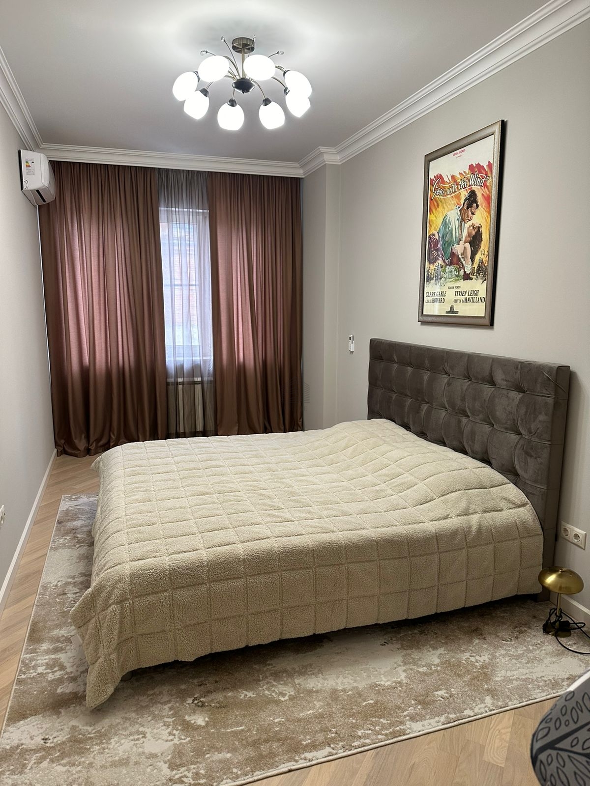 Квартира находится на 4 этаже . Планировка: общ. S=70 кв м, спальня и кухня-гостиная, с/у совмещенный . Высота потолков 3 м.