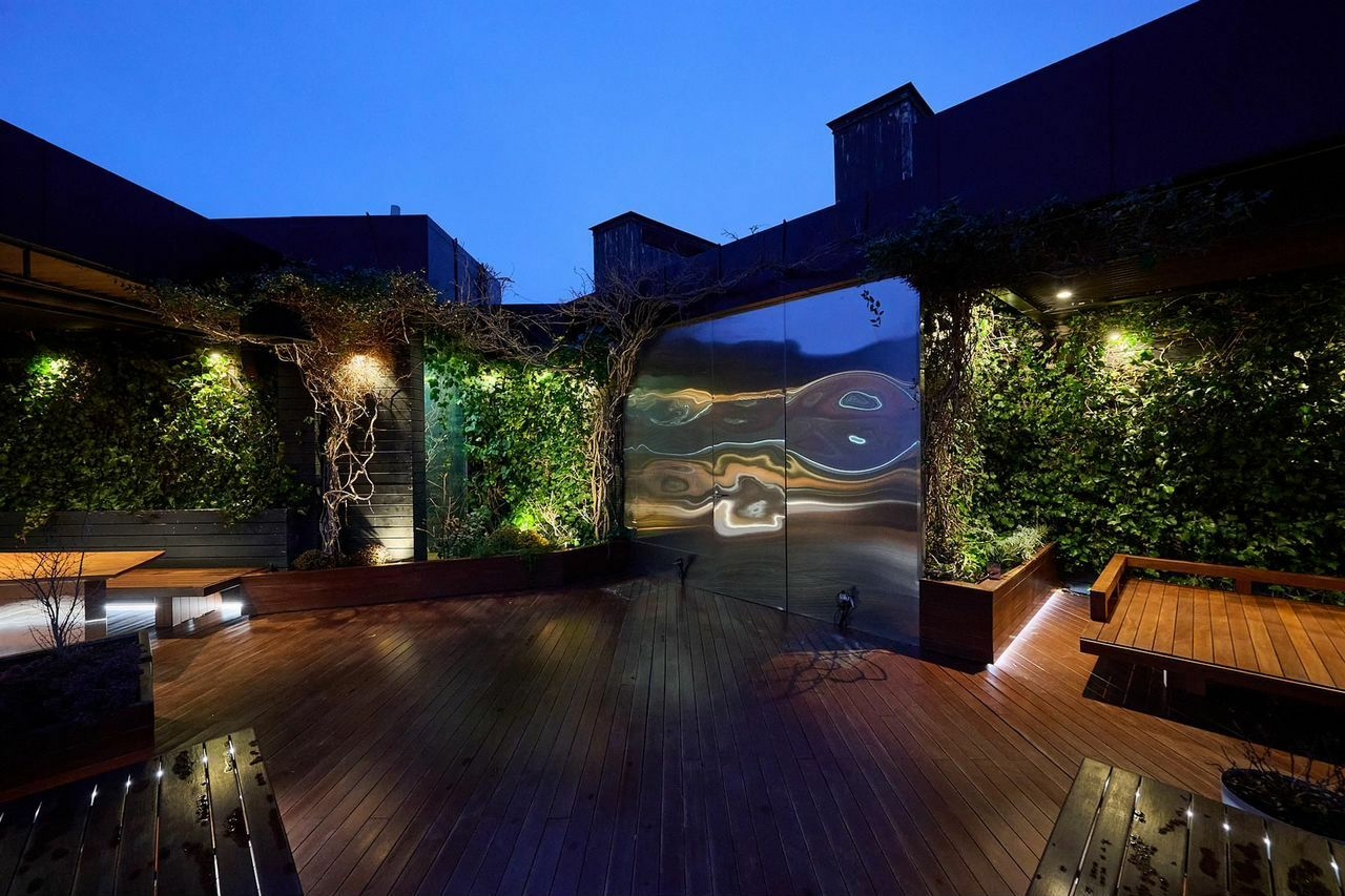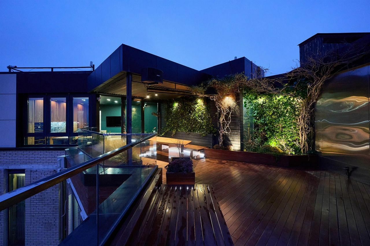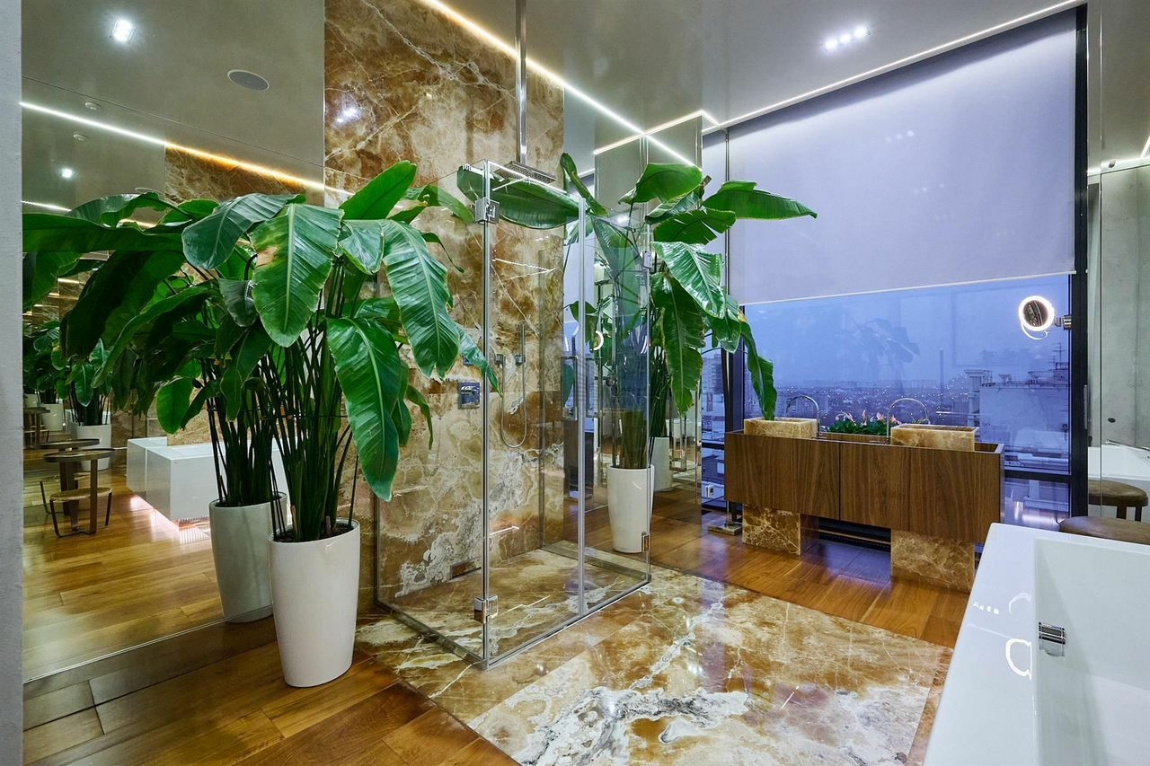 Общая площадь квартиры с террасой и эксплуатируемой кровлей более 329,3 м². Планировка позволяет при желании добавить изолированные комнаты. Есть прачечная, просторные залы, кабинет, зал для йоги. Приточно-вытяжная вентиляция поддерживает чистый воздух и комфортную температуру в любое время года. Терраса с садом ухаживается профессиональными садовниками, проектор и монитор создают кинотеатр под открытым небом.