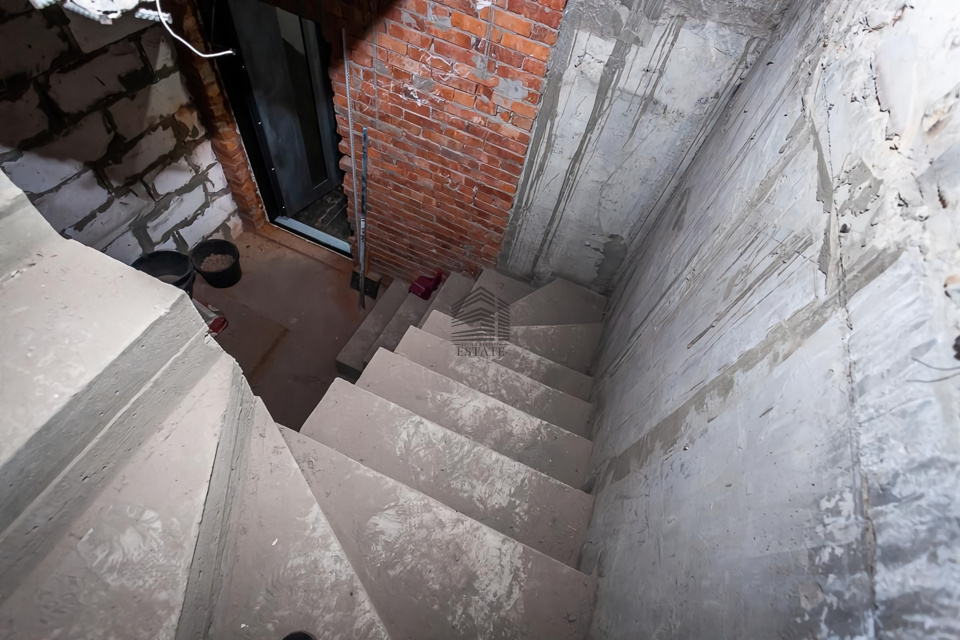 Первый этаж — прихожая и лестница. Второй этаж — библиотека, каминный зал, терраса, кухня, две спальни, два санузла, два гардероба, постирочная и кладовая. Панорамные окна новые и качественные, материалы стен и крыши премиальные. Все капитальные работы по утеплению и планировке выполнены, разводка коммуникаций под дизайн-проект готова к финишному ремонту.