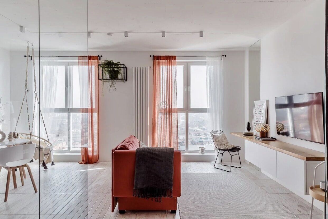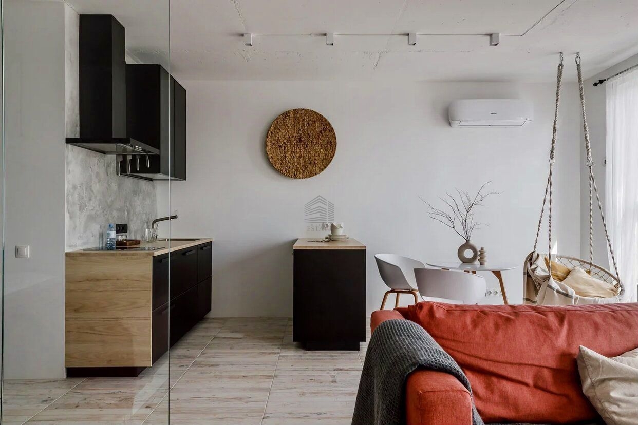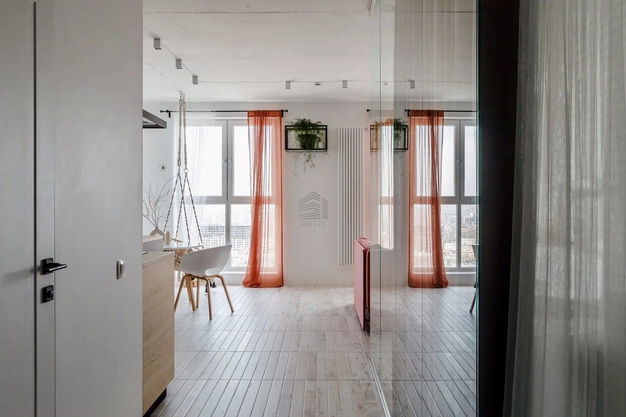Квартира находится на 22 этаже . Из окон открываются потрясающие виды на историческую часть города. Планировка: общ. S=44 м, кухня 23 м, панорамные окна, гардеробная.