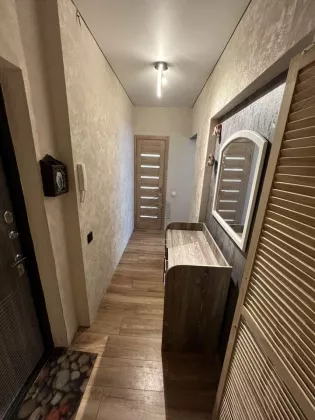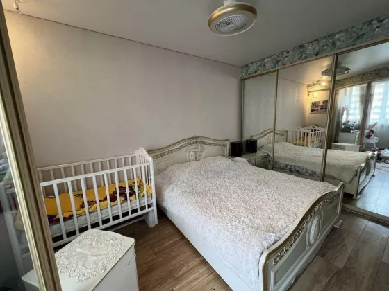 Квартира находится на 4 этаже . Окна выходят во двор (двор без машин, с озеленением) Планировка: общ. S=63 м, площадь квартиры организованна следующим образом: большая кухня-гостиная, посторный совмещенный с/у, одна спальня и одна комната отведена под детскую, гардеробная, отдельно постирочная.