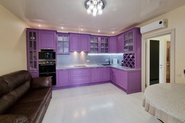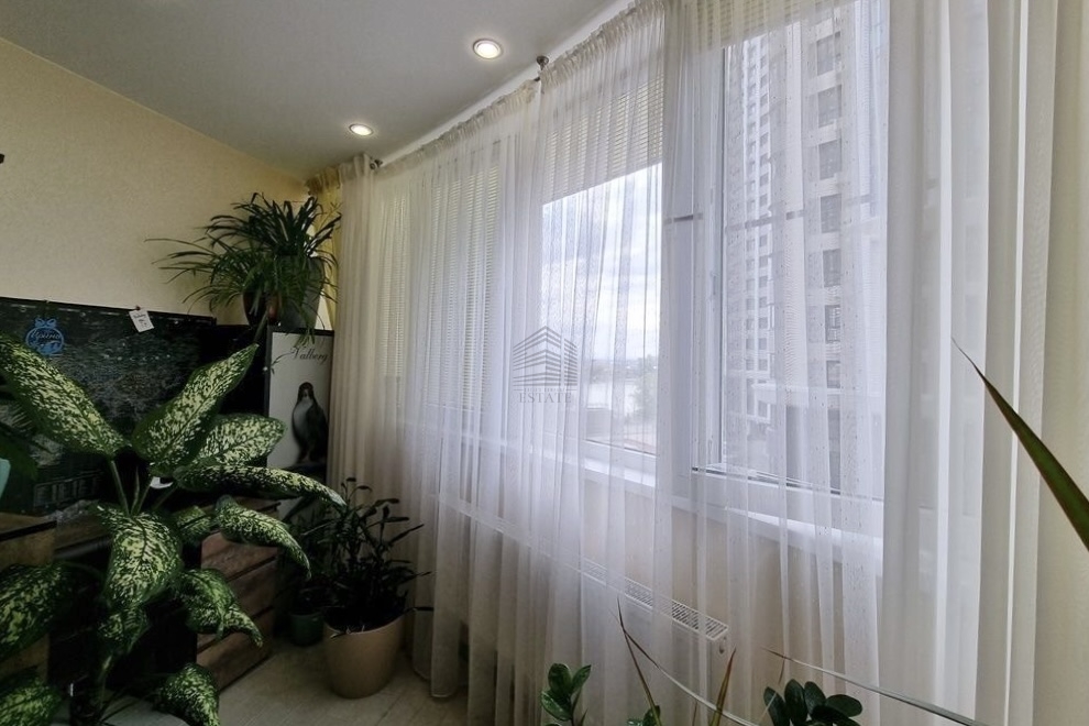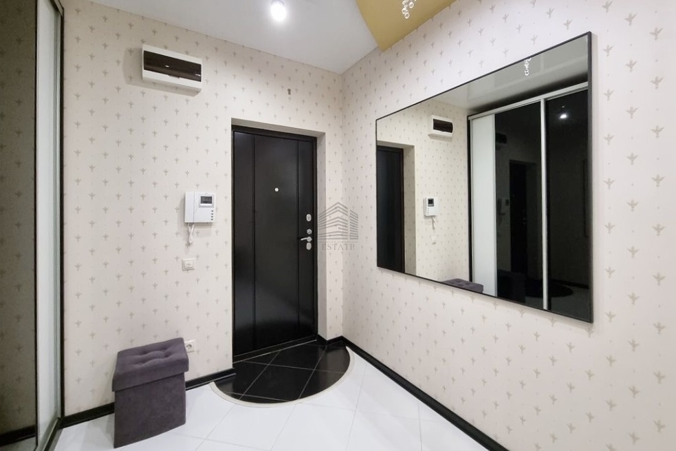 Дизайнерский ремонт с использованием натуральных материалов, мебель на заказ от известных брендов. Кухня со столешницей из камня, техника Miele и Gorenje: духовой шкаф, варочная панель, посудомоечная машина, стиральная машина, встроенная СВЧ, кофемашина, вытяжка. Холодильник LG, 2 сплит-системы Tosot, 2 широкоформатных TV (LG, Sony). В кухне — диван из натуральной кожи, в спальне — кровать с матрасом Askona. На лоджии — рабочая зона. Бойлер на 150 л. В доме: подземный и наземный паркинг, видеонаблюдение, консьерж.